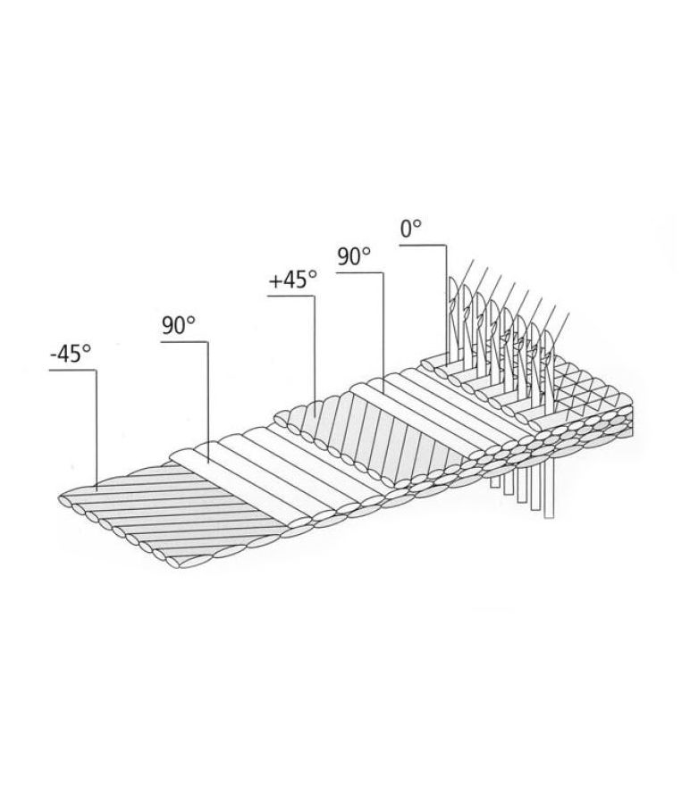 In einem Laminat mit quasiisotropem Lagenaufbau finden wir 4 Faserverlaufsrichtungen vor. Bauteile, welche aus diesem Material gefertigt sind, weisen in allen Belastungsrichtungen annähernd die gleichen mechanischen Eigenschaften auf. Das Carbonmaterial verhält sich durch die Anordnung der Faserwinkel in 0° / +45° / -45° (=135°) / 90° annähernd isotrop.